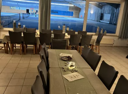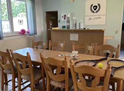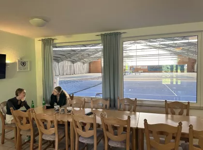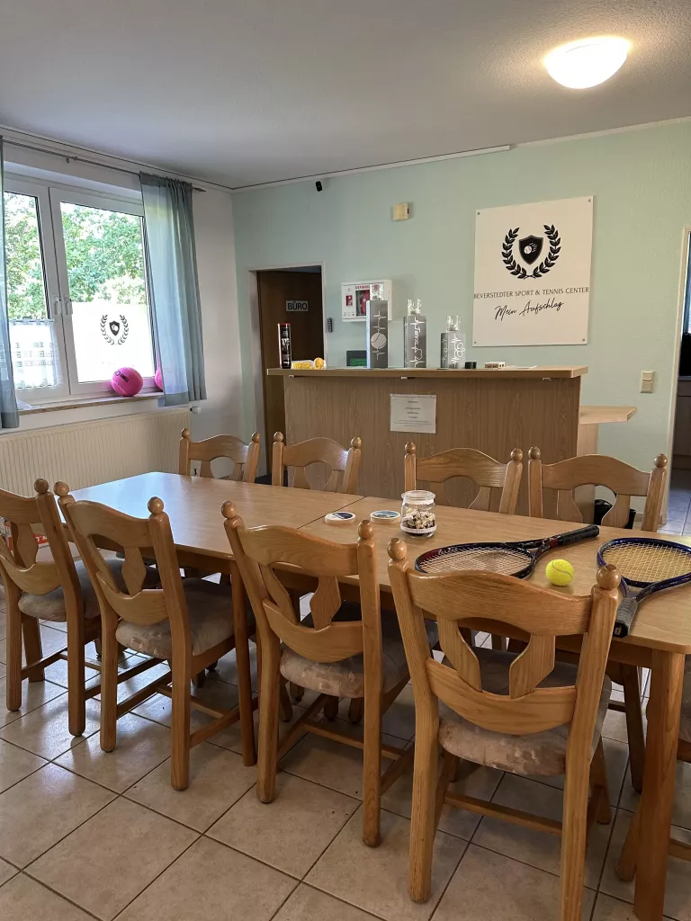 Genieße dein Getränk in dem großem Aufenthaltsraum direkt neben der Küche. Mit genügend Sitzmöglichkeiten, ist er der perfekte Ort, um den Besuch, mit Ausblick auf die Courts durch das riesige Panorama Fenster, aus klingen zu lassen.